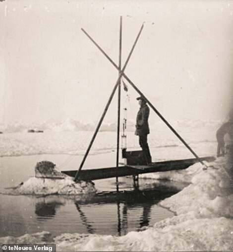 На этой фотографии 1894 года Нансен с помощью Педера Хендриксена на заднем плане изучает температуру Северного Ледовитого океана на разных глубинах. В своем дневнике Ялмар Йохансен записал: «Каждый день в 12 часов проверяются температура и соленость морской воды».