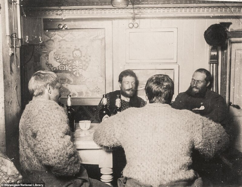 Члены экипажа Ялмар Йохансен, Хенрик Греве Блессинг, Отто Свердруп и Скотт Хансен играют в карты на корабле в первую зиму плавания, пока судно, застрявшее в толще льда, дрейфовало от Новосибирских островов на запад в сторону Шпицбергена. «Первая зима прошла быстро. Научная работа была в приоритете, но общественная жизнь тоже была важна», — пишет Кловер, добавляя: «Карточные игры были самым популярным времяпрепровождением. Все игры велись под отдельный протокол, в который также записывали сплетни, шутки и лихие розыгрыши». В книге отмечается, что фотография была сделана, «когда на борту еще было пиво Ringnes Bock». Автор поясняет, что Нансен «боялся, что алкоголь может привести к проблемам на борту, но позаботился о том, чтобы было включено 3000 бутылок пива». Он добавляет: «К сожалению, в первую зиму бутылки замерзли и разбились, и много стекла пришлось выбросить за борт».