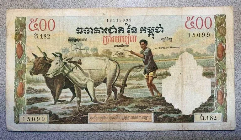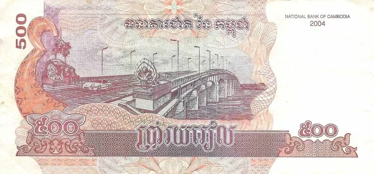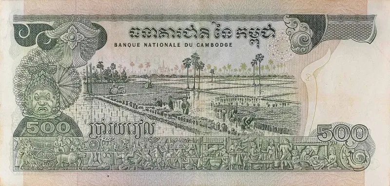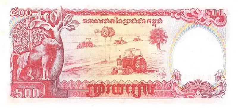 Интересно, что на камбоджийских «пятисотках» издавна изображаются транспортные средства, будь то трактор, пара волов или неопознанный спортивный автомобиль. Толи Porsche, толи Mitsubishi 3000GT.