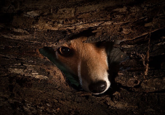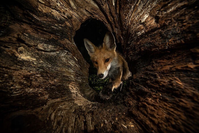 В поисках добычи в старом стволе дерева. Фотограф установил туда камеру, которая активируется при движении