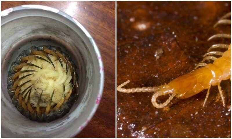 Житель Таиланда случайно обнаружил это жутковатое создание в ведре. Это - самка многоножки, предположительно Geophilomorpha, геофила. Количество пар ножек у этих беспозвоночных варьирует от 27 до 191. При этом они могут очень быстро ползать, и питаются в основном насекомыми и другими беспозвоночными.
