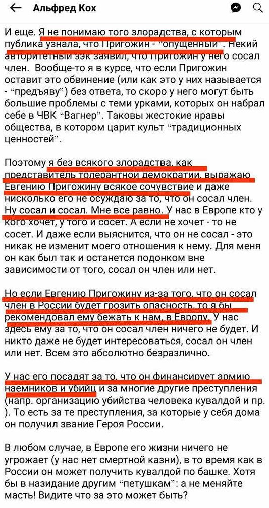Бывший зампредседателя Правительства Российской Федерации Альфред Кох пригласил Пригожина бежать в Европу, поскольку там ему за его «утехи» ничего не угрожает. Тогда как в России «он может получить кувалдой по башке».