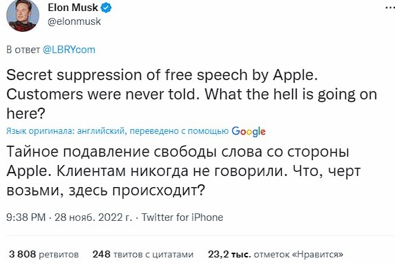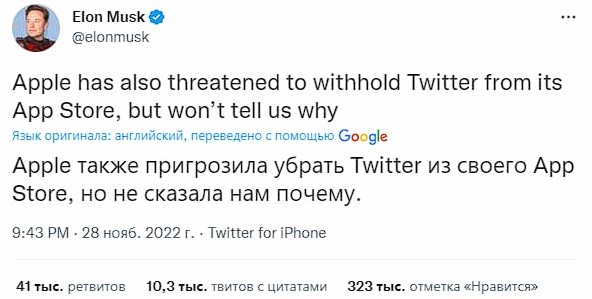 Перед этим Маск сообщил, что Apple угрожает удалить приложение Twitter из магазина приложений AppStore.