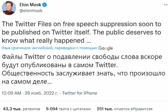- Пока вы спали, в интернете началась какая-то революция: Илон Маск выступил против онлайн-цензуры в США и заявил, что Twitter скоро опубликует документы о подавлении свободы слова.