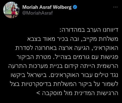 - В Израиль прибыла делегация из Украины во главе с генерал-майором ВСУ, — пишет журналистка телекомпании «Кешет» Мория Уолберг.