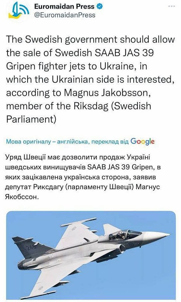 - Швеция должна разрешить продажу истребителей SAAB JAS 39 Gripen, в которых заинтересована украинская сторона, — депутат парламента страны Якобссон.
