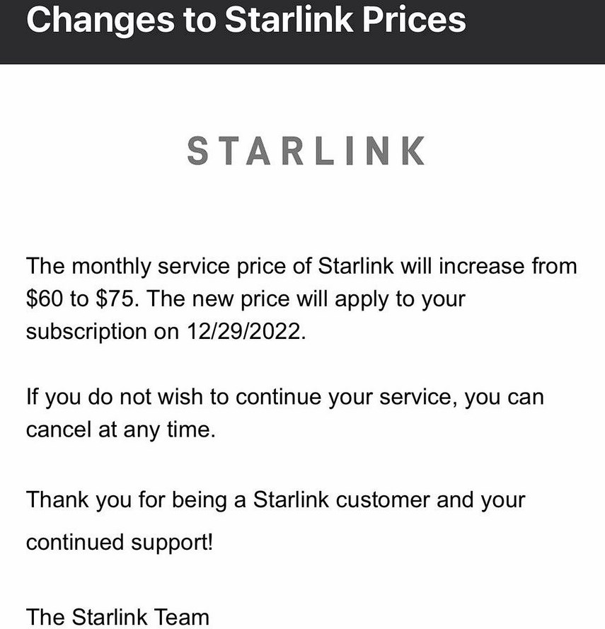 - Starlink Илона Маска повышает тарифы для украинцев. На почту украинским абонентам приходят письма такого содержания: "Провайдер спутникового интернета Starlink повысил стоимость услуг для украинцев с $60 до $75 в месяц. Стоимость услуги повысится с 29 декабря. А терминал и антенна теперь стоят не $500, а $700.