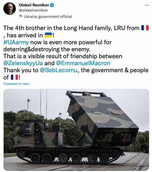 - Министр обороны Украины Алексей Резников сообщил, что в Украину прибыли французские аналоги HIMARS — реактивные системы залпового огня LRU.
