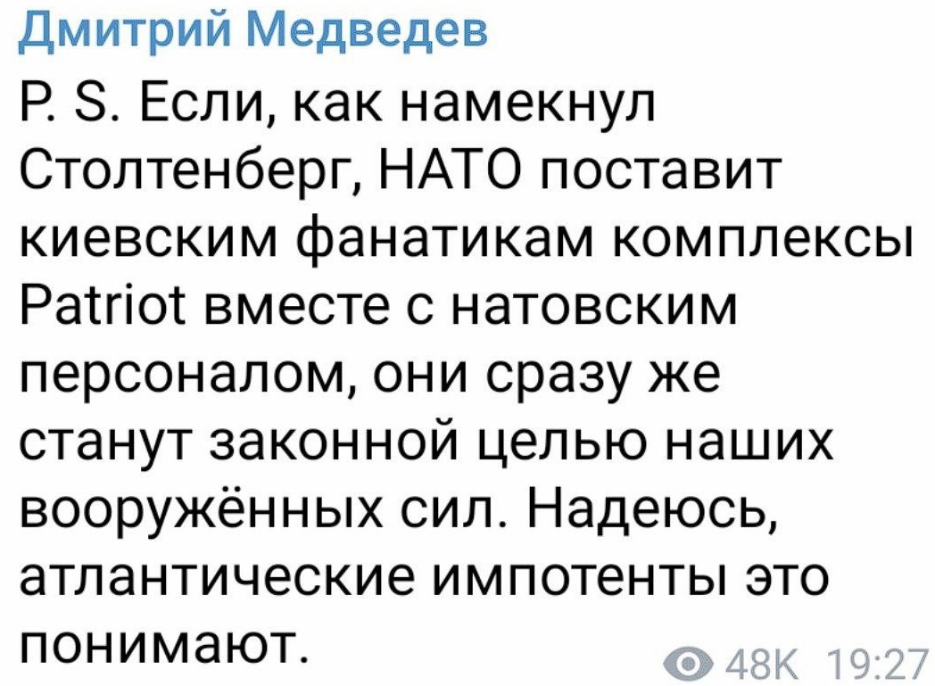 - Если НАТО поставит Украине зенитно-ракетные комплексы Рatriot и предоставит свой персонал, то они сразу станут «законной целью» Вооруженных сил рф, — напомните Димке, что сегодня не пятница и алкашку мешать нельзя.