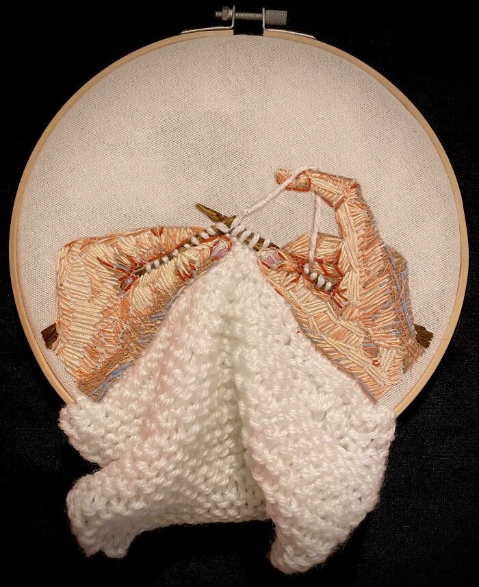6. "К этой вышивке пришит мой первый образец вязания. Это напоминание о том, что мы должны чтить тех, кто сделал нашу одежду, даже если мы не знакомы"
