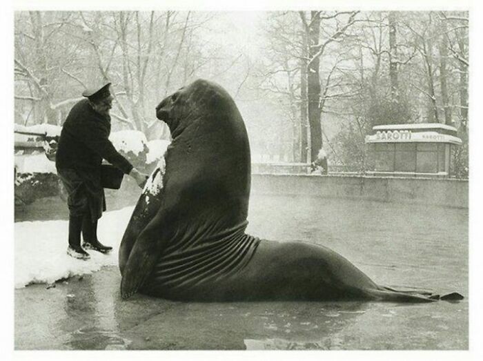 18. Роланд, морской слон весом 1,8 тонны, принимает ванну в Берлинском зоопарке. Фотография 1930 года