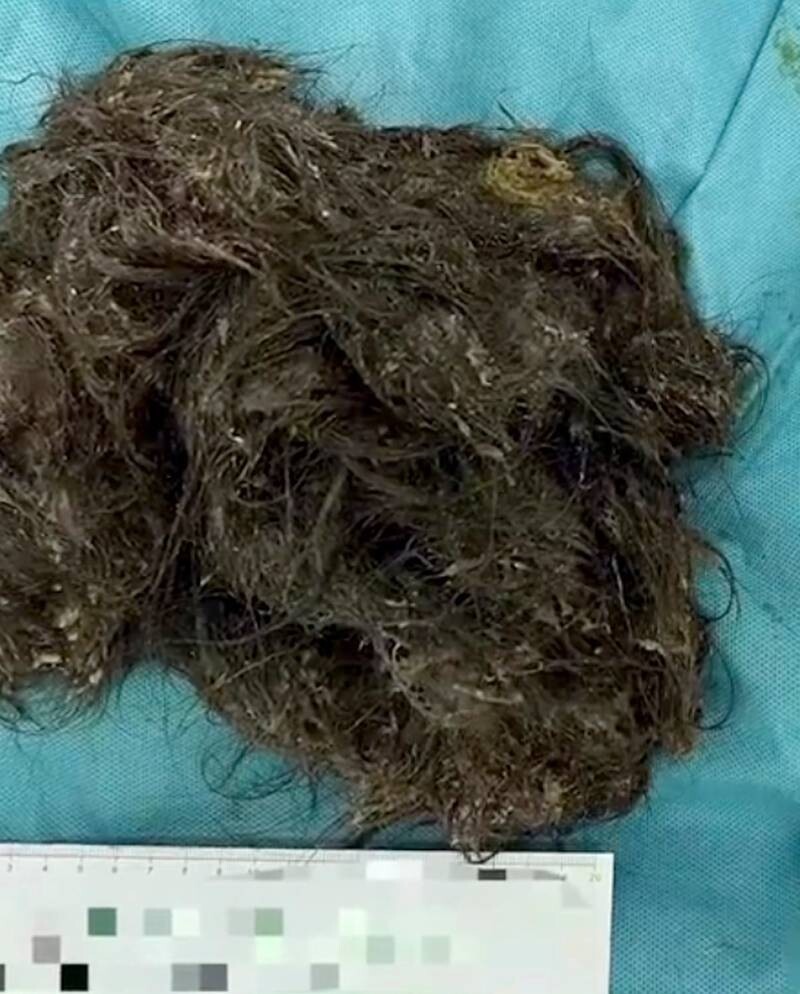 Хирурги провели операцию, которая длилась два часа, и удалили из желудка из кишечника огромное количество волос (3 килограмма — это примерно вес кирпича). Немудрено, что девочка не могла есть. Ее желудок был настолько заполнен, что в нем просто не оставалось места для еды. Кишечник также был заблокирован.