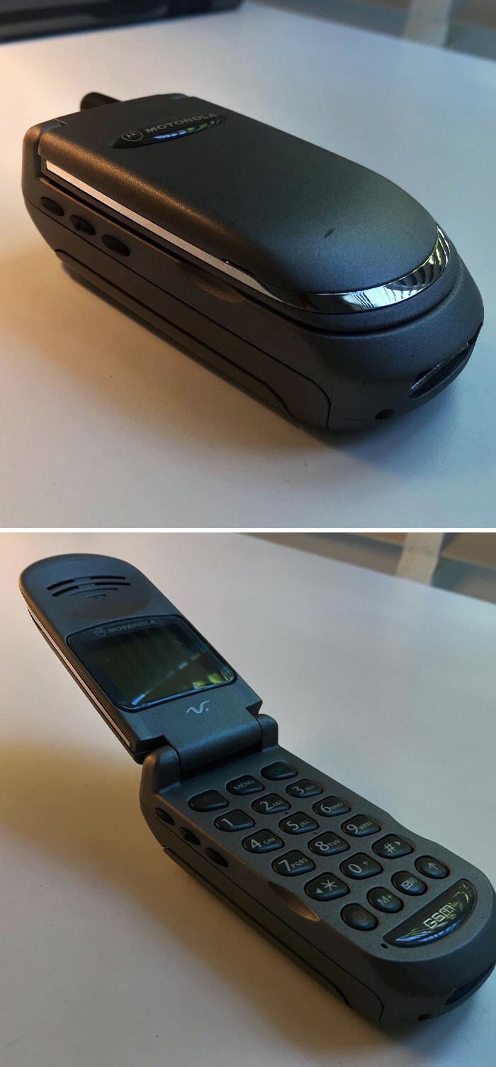 18. "Моя красивая Motorola V50. В темно-сером цвете, который, на мой взгляд, выглядит лучше всего. Отличный телефон, очень маленький, компактный, с большим радиусом действия и работает в сетях 2G"