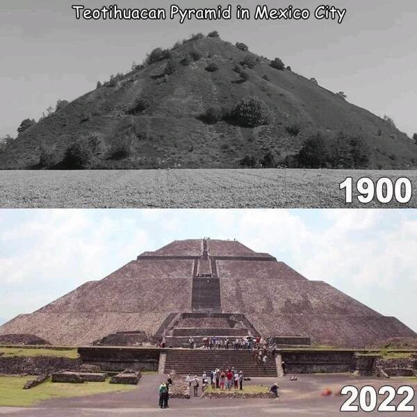 Пирамида Солнца в Мексике до раскопок и сейчас