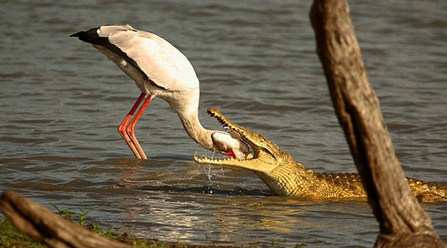 Жестокий мир: цапля отбирает еду прямо из пасти у бедного голодного крокодила