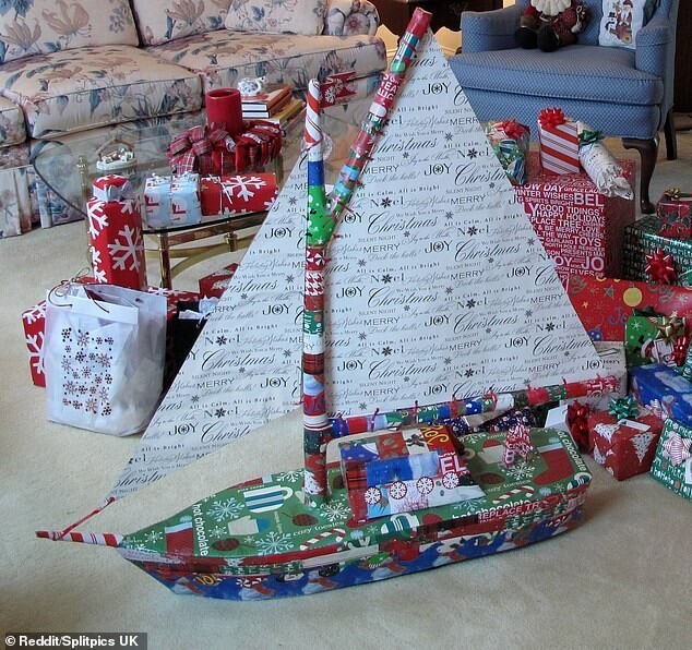 В этой упаковке в морском стиле нет модели лодки. Таким образом дарители искусно обернули обычный зонт.