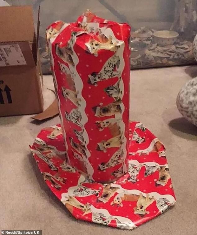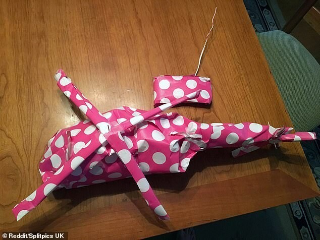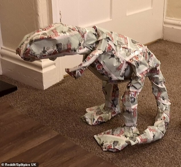 Этот подарок в виде искусно свернутого из упаковочной бумаги динозавра, на самом деле содержит шар для боулинга.