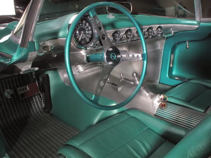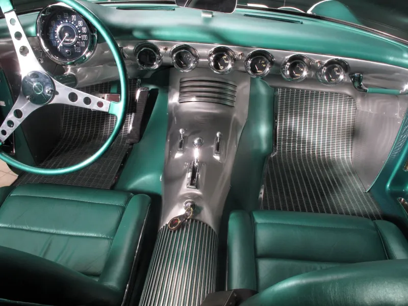 Безупречный стиль породистого купе с амбициями стать реактивным самолетом был перенесен в салон в виде целого ряда хромированных приборов, большого трехспицевого руля и зеркала заднего вида, установленного на приборной панели. Внутри два ковшеобразных сидения, и по сути это был первый автомобиль такого типа, на носу которого красовался значок Pontiac. На спидометре максимальная скорость 120 миль в час — 193 км/ч. Нет тахометра и радио, зато есть часы Elgin и двухточечные ремни безопасности.