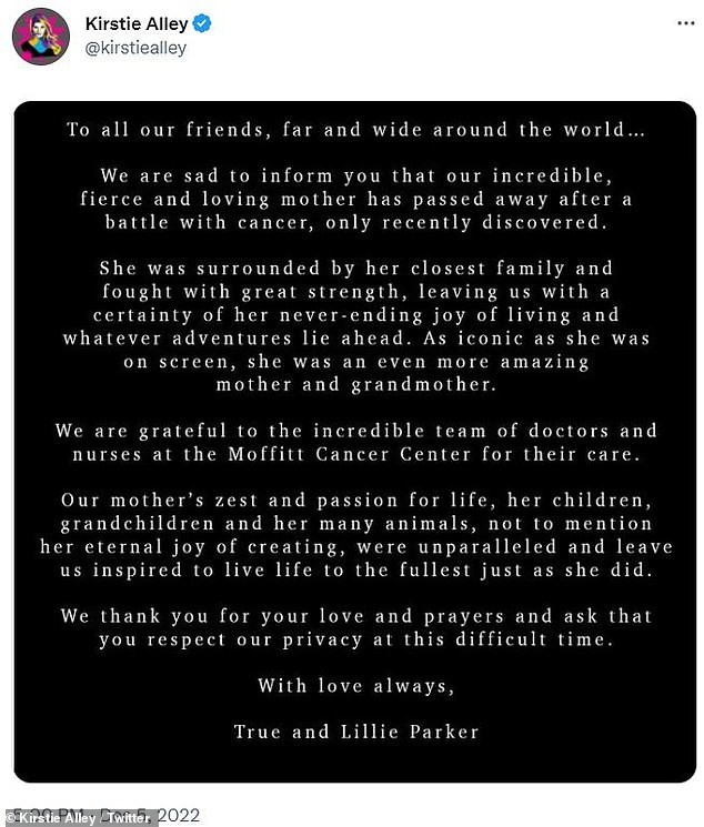 Нам грустно сообщать вам, что наша необыкновенная, сильная и любящая мама умерла после борьбы с раком, который был выявлен совсем недавно"