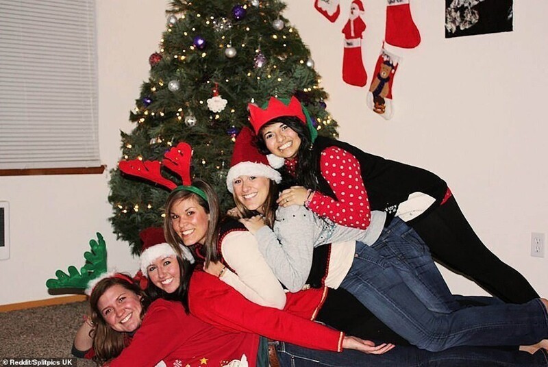 Фотография в уродливых рождественских свитерах - отличная тема. А вот слюной обменяться можно было и в другом месте