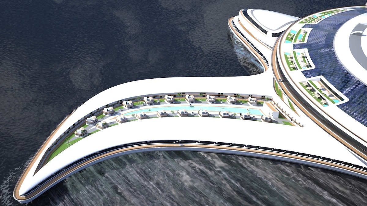 Яхта будет оснащена девятью электрическими двигателями мощностью 16 800 лошадиных сил каждый. Во время плавания большие крылья будут получать энергию от торможения волн, что позволяет яхте плыть бесконечно. Это также означает отсутствие грязных выбросов в море. Крыша с солнечными панелями восполнит потребности города в электричестве за счет экологически чистой энергии.