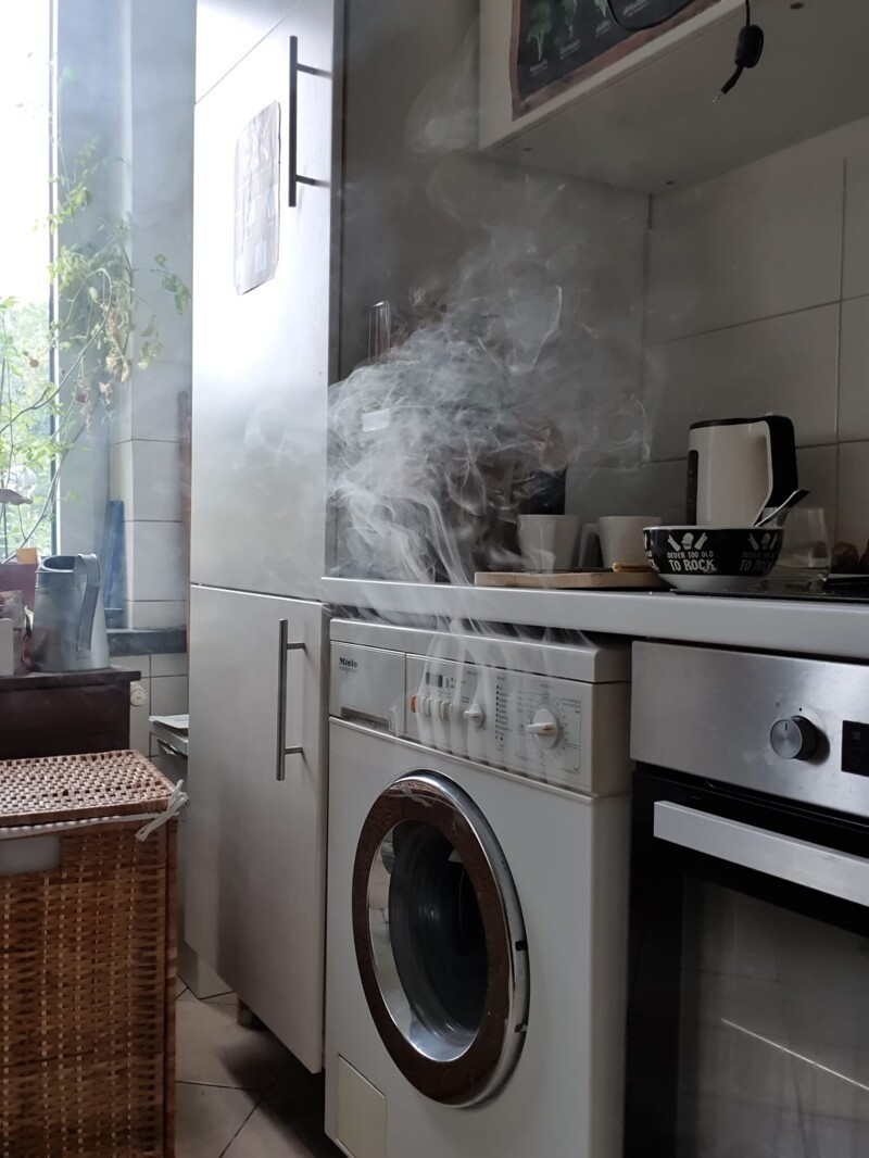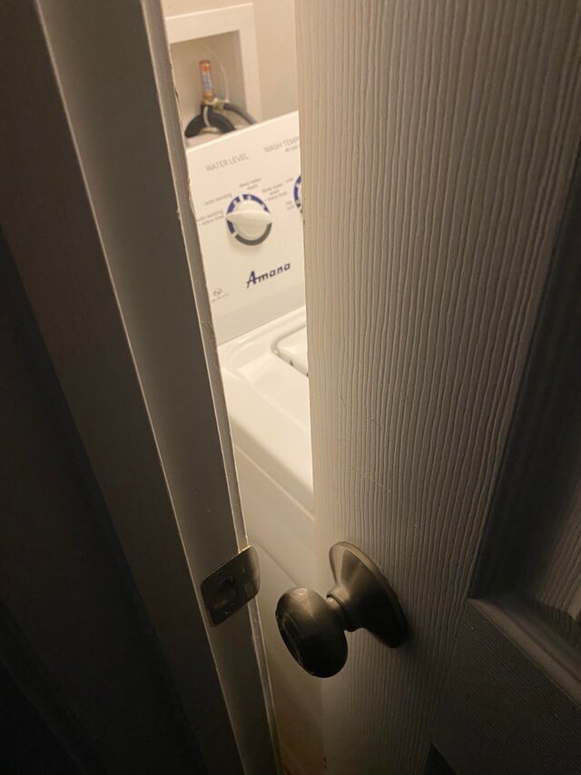 Стиральная машинка выпрыгнула вперед и подперла дверь, а с другой стороны раковина