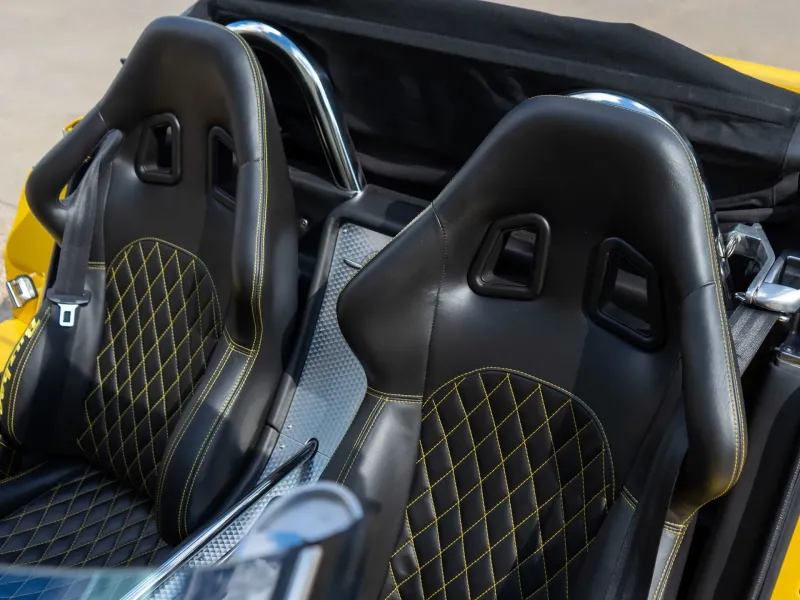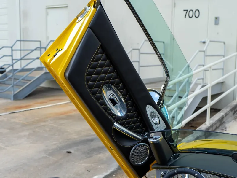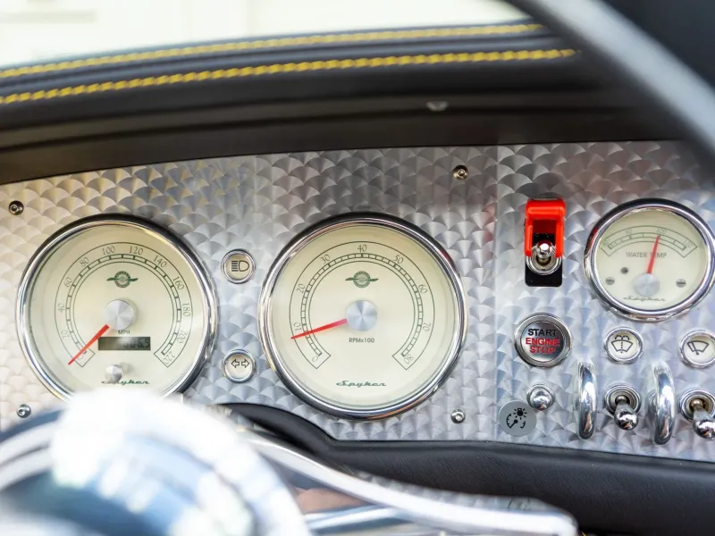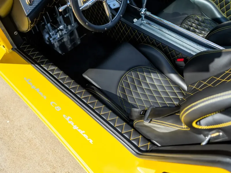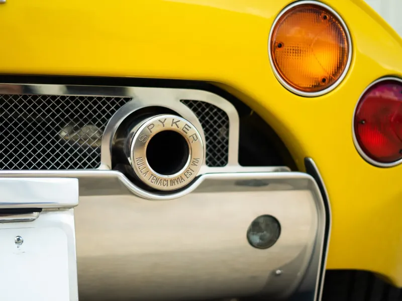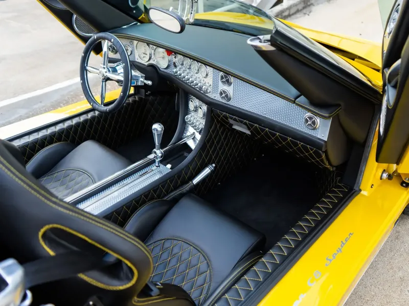 Жёлтый кузов спайдера сочетается с чёрной кожей в салоне с жёлтой строчкой. По данным продавца, среди всех Spyker C8 Spyder только четыре машины имели аналогичную отделку.