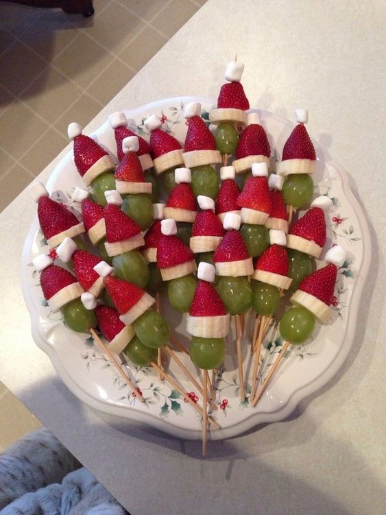 Для этой закуски понадобится 5 вещей: шпажки, маршмелоу, клубника, банан и виноград