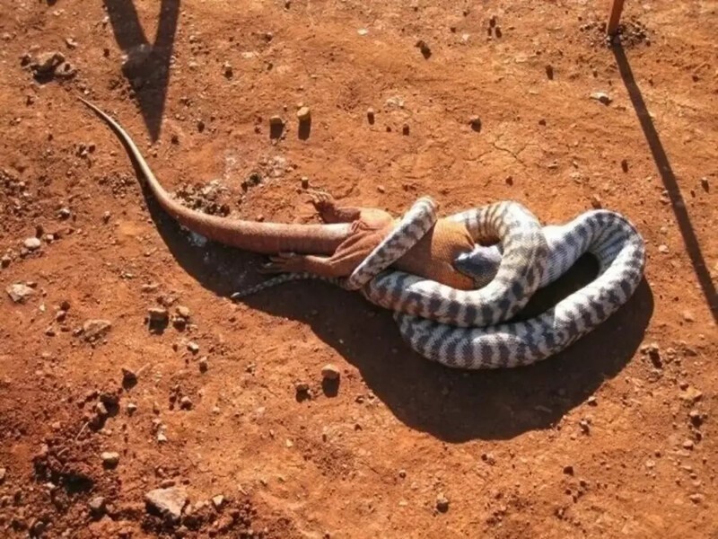 Огромный питон тащит из реки валлаби (сумчатое из семейства кенгуровых)