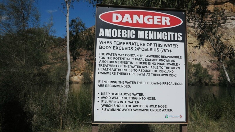 В некоторых местах здесь и вода опасна. Вот, объявление у пресного водоёма предупреждает, что в воде могут содержаться амебы, вызывающие амебный менингит - редкое заболевание, которое может иметь фатальный исход
