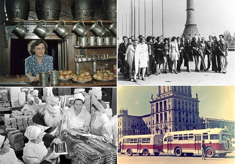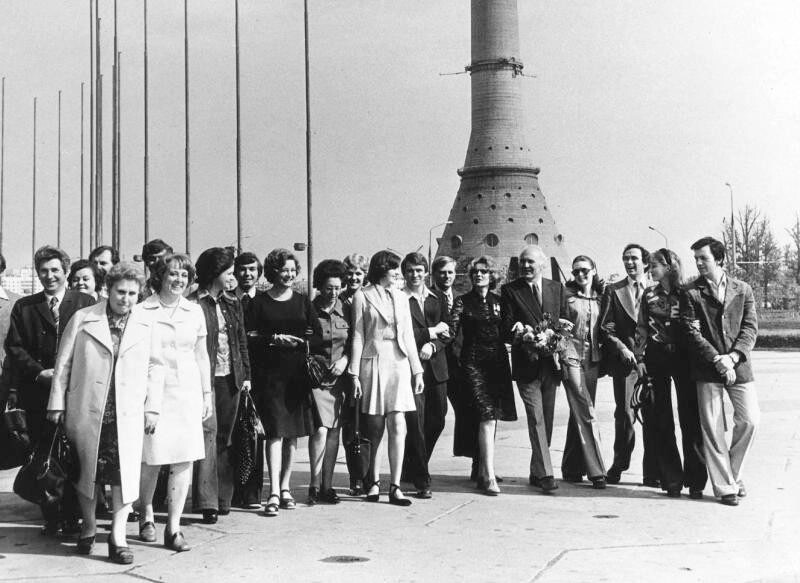 Дикторы телевидения на фоне телебашни. 1970-е Москва, ул. Академика Королева. Фото Евгений Халдей