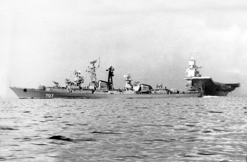 Большой противолодочный корабль «Красный Кавказ» рядом с будущим тяжелым авианесущим крейсером «Адмирал Флота Советского Союза Кузнецов». Ходовые испытания, 1990 год