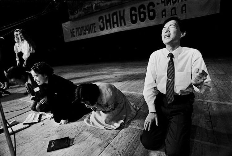 Коллективная молитва одной из сект в ожидании конца света, Москва, 1992 год