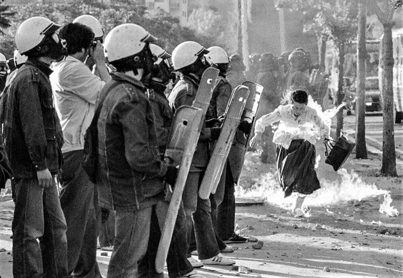 Женщина попала под коктейль Молотова, брошенного во время антиправительственной демонстрации в Университете Данкука. Сеул, Республика Корея, 1988 год