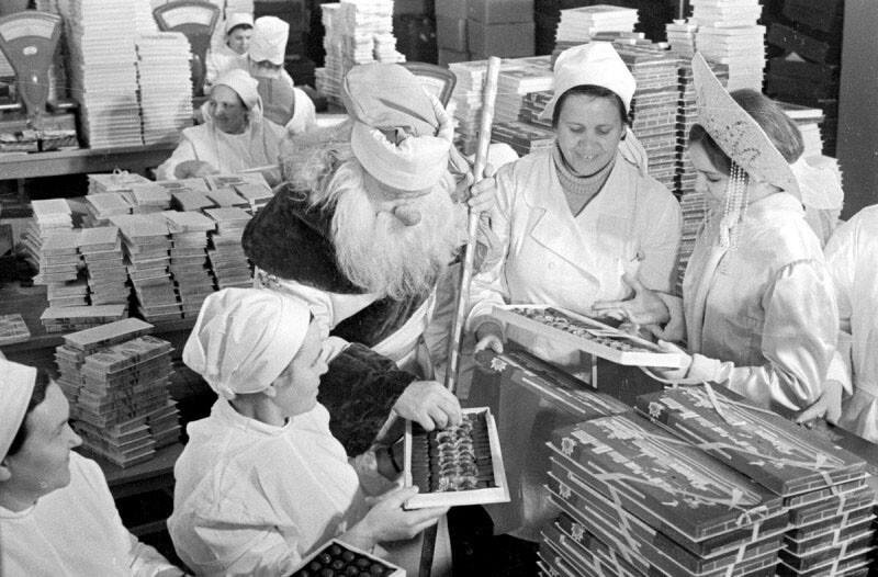 Дед Мороз в гостях на Горьковской шоколадной фабрике. Фото В. Войтенко, 1971 год