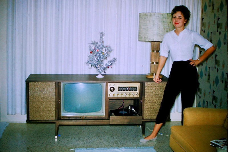 Симпатичная девушка в брюках Капри с музыкальным телекомбайном на Рождество. США, начало 1960-х