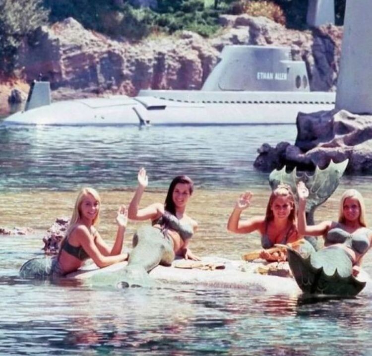 Русалки в Диснейленде машут пассажирам аттракциона «Подводная лагуна», приблизительно 1960 год