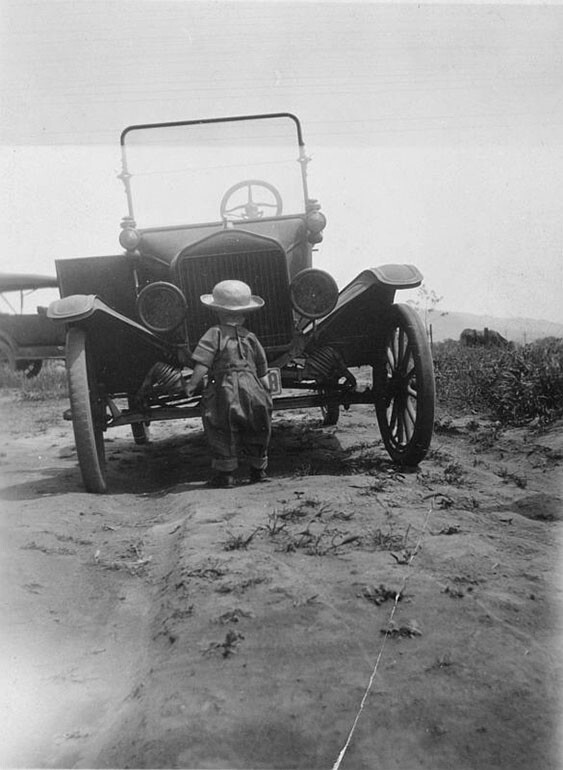 Крошечный Марвин Симпсон пытается завести машину по адресу 1453 Sunnyside Ave. в Визалии, Калифорния. 1922 год