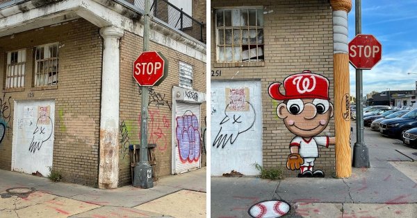 Назвать эти граффити "вандализмом" язык не поворачивается, ибо это творчество действительно украшает улицы. Любой унылый уголок сразу же превращается в красочный арт-объект. Стены буквально излучают позитив и у каждого прохожего автоматически поднимется настроение. Давайте поглядим на крутое уличное искусство от американского стрит-художника Тома Боба.
