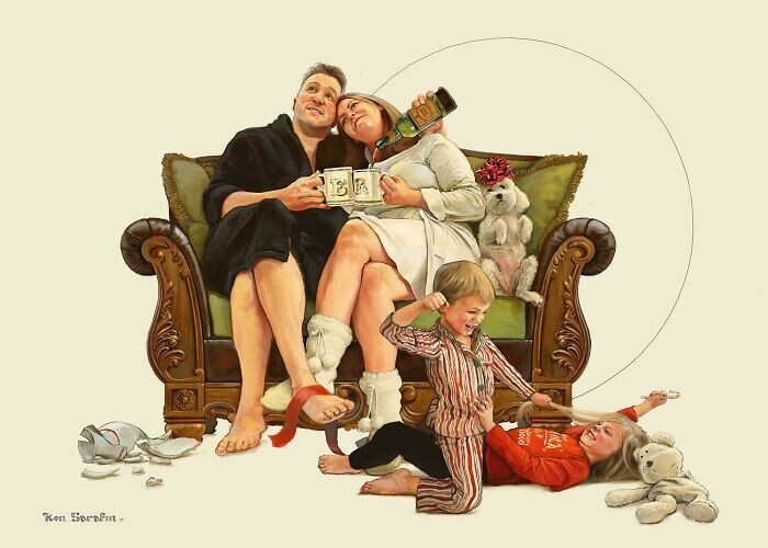 "Каждый год я иллюстрирую рождественскую открытку для семьи моей сестры в стиле Нормана Роквелла. Вот открытка этого года!"