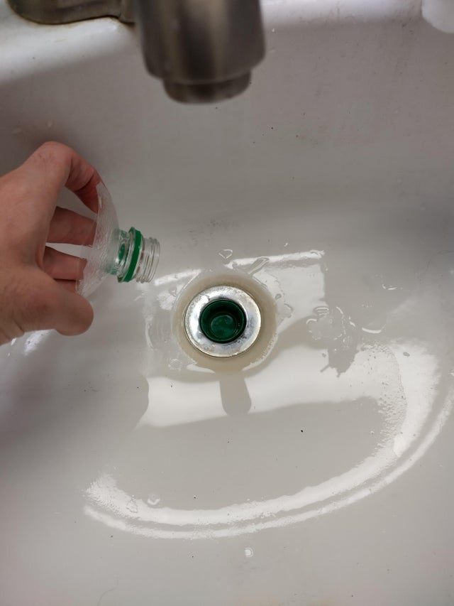 Крышка от бутылки как затычка для слива. А чтобы её удобно вытащить, не выбрасывайте горлышко. Прикрутите её к крышке — и проблема решена.