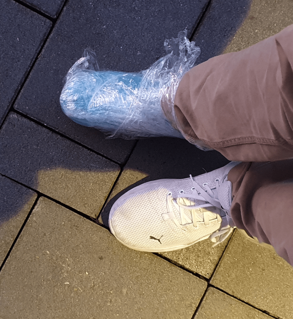 Пришлось обратиться к врачу с травмированным пальцем ноги, из-за которого моя нога не могла влезть в ботинок. И вот такое вот решение для защиты ноги от непогоды...