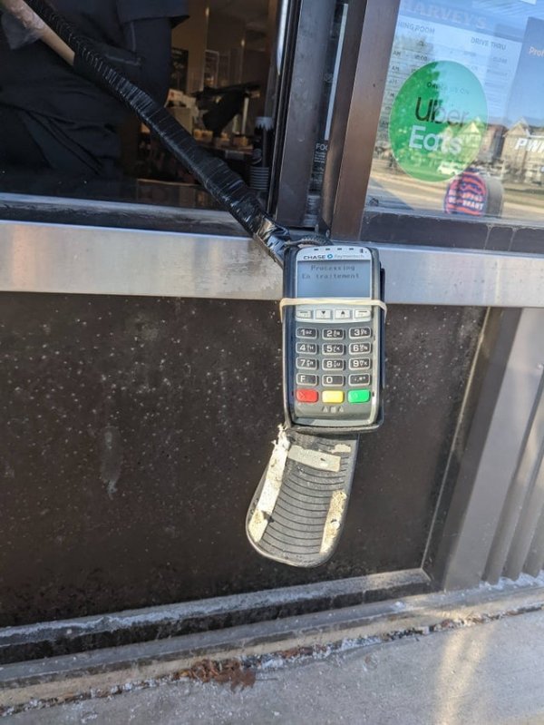 В этом автокафе терминал прикреплён к хоккейной клюшке