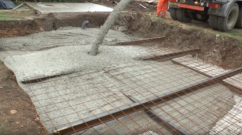 После того, как потолок был установлен и заварен, пришло время покрыть его очень прочным, армированным стекловолокном бетоном. Бетон заливали в несколько этапов для пущей прочности Бетон заливали в несколько этапов на прочность.