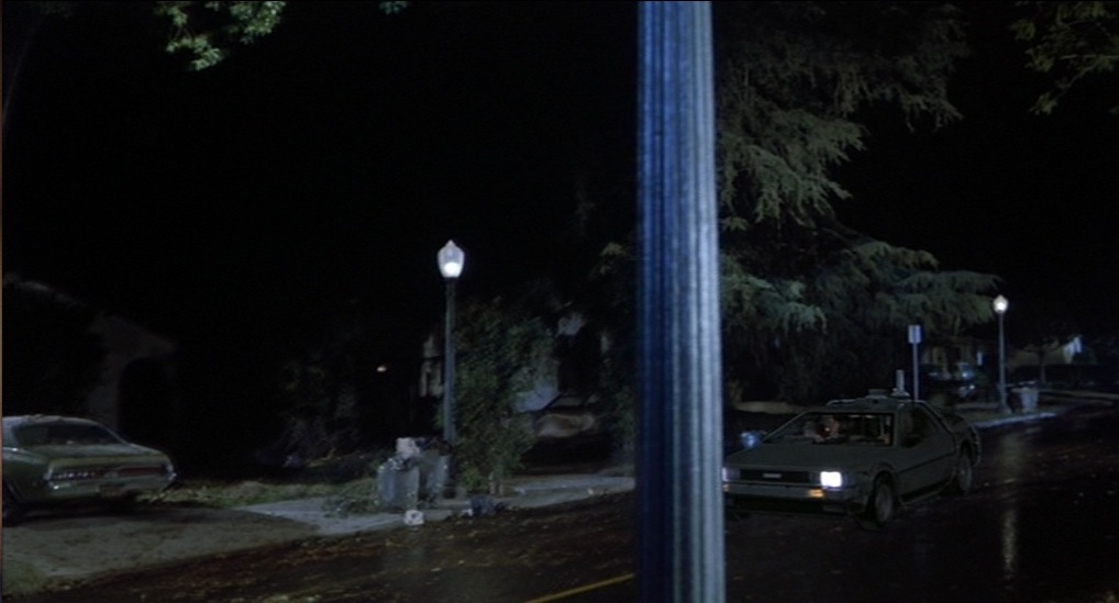 Летающий DeLorean превращается из модели с маленькими марионетками в полноразмерный автомобиль с реальными людьми прямо на наших глазах, когда пролетает за фонарным столбом.