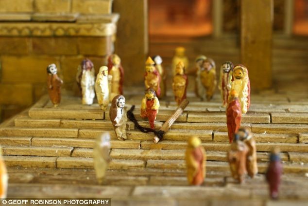Он вырезал каркасы стен храма из фанеры, обжег глиняные кирпичи в печи, а затем склеил их, и даже вылепил и раскрасил 4000 крохотных фигурок и нарядил их в костюмы.