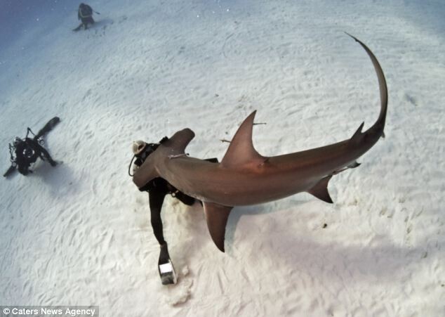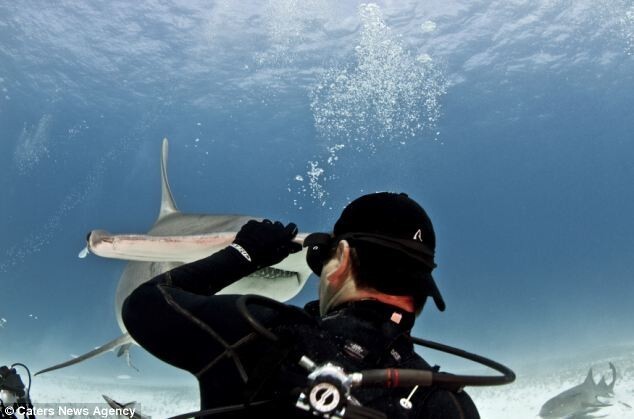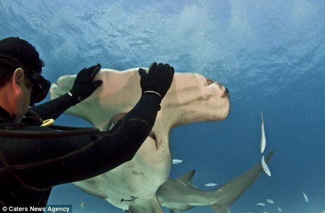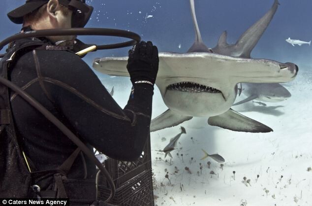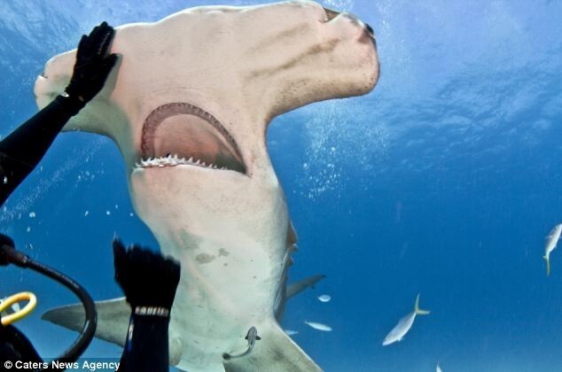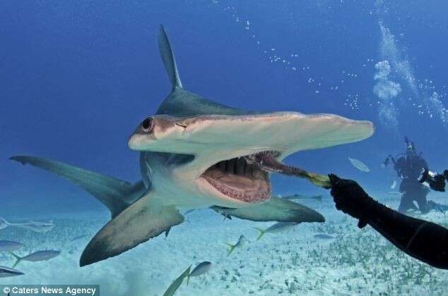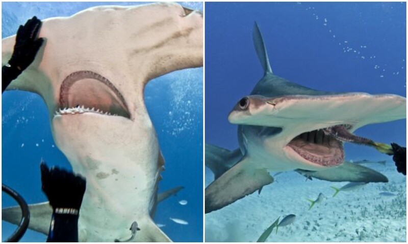 Эти кадры сделали под водой у Багамских островов, в районе Бимини. На них бесстрашный дайвер Эли Мартинез кормит рыбкой молотоголовую акулу всего-то длиной три метра. Зрелище кажется страшноватым, но на самом деле, до этого дайвер несколько месяцев погружался и завоёвывал их доверие - поэтому акулы привыкли получать вкусняшки.