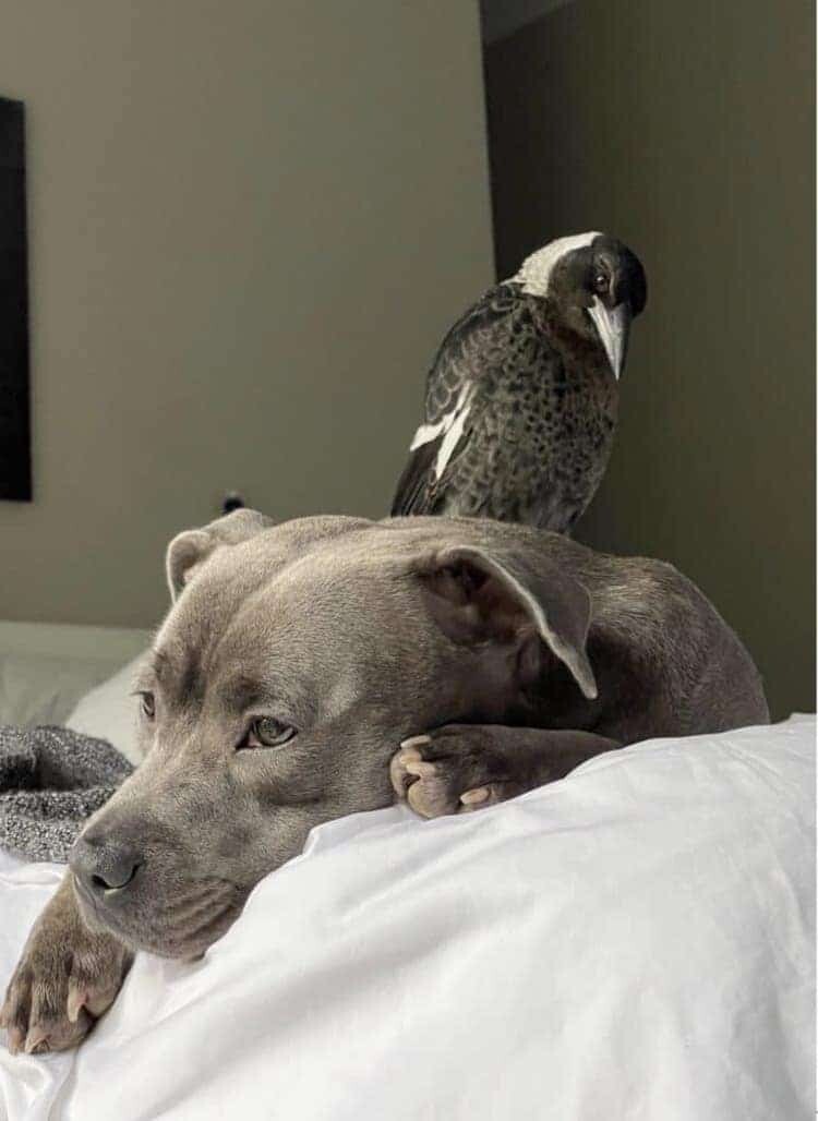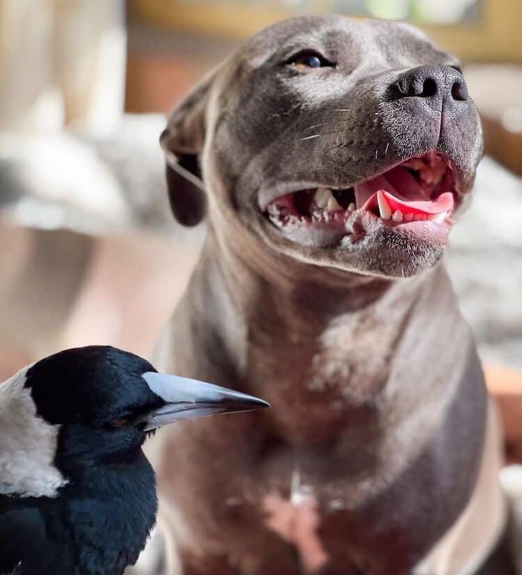Эти трое очаровательных друзей живут в австралийском штате Квинсленд с хозяевами. Взрослая Пегги, стаффордширский бультерьер, её дочка Руби, и спасённая сорока по кличке Молли крепко сдружились неожиданно для всех. Они играют, спят вместе, любят проводить время друг с другом и гулять во дворике.