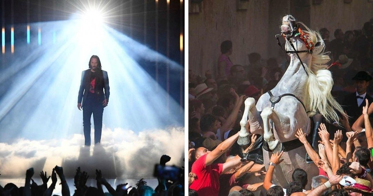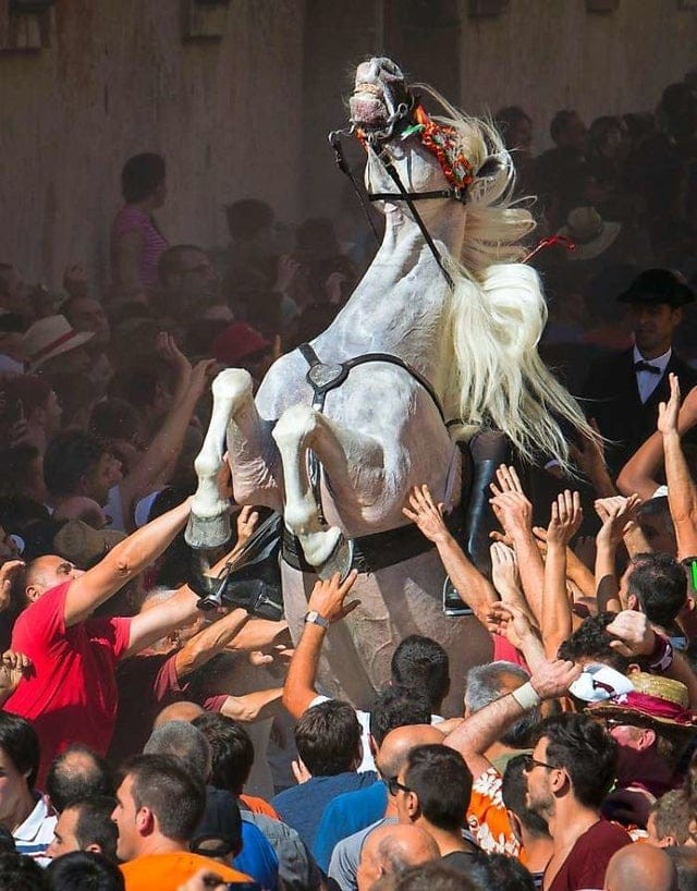 На самом деле это фото сделано на традиционном празднике Святого Хуана в Испании, на Менорке. Когда лошадь проходит через человеческую толпу, несмотря на риск быть задавленными животным или сородичами, люди стараются дотронуться до коня — это считается очень хорошей приметой.