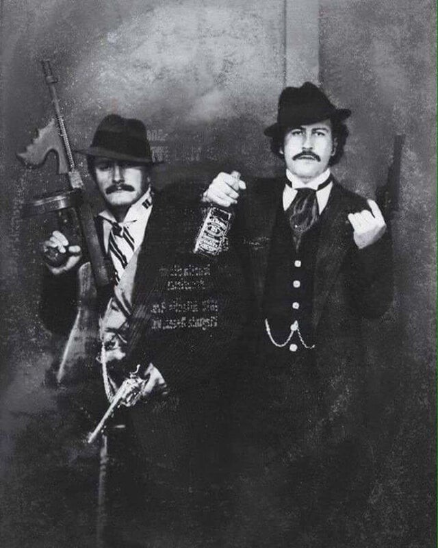 Пабло Эскобар и его двоюродный брат, переодетые американскими гангстерами